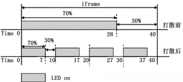 大香蕉久久久知道LED顯示屏幾個核心的部件,如LED開關電源、LED驅動芯片、LED燈珠等,針對LED顯示屏的刷新頻率和灰度等級,LED驅動芯片直接決定了LED顯示屏在視覺刷新頻率、灰度等級的表現。在目前LED驅動芯片之中,最高新的技術為“ScrambledPWM(S-PWM)技術”,S-PWM技術是改進傳統脈波寬度調變(PWM)的技術,其將一個影像導通的時間分散成數個較短的導通時間,以增加整體的視覺更新率。更進一步說明,新一代的LED驅動芯片所內建的S-PWM技術,能將原本每幀(frame)計數一次(LED晶粒ON→LED晶粒OFF)的方式,平均打散成多次計數,且每個打散的等份,皆可維持原先未打散前的On/Off比例,如下圖所示。